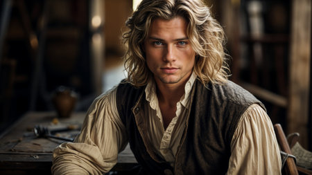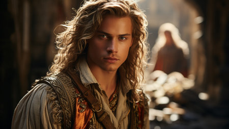 Portrait of a handsome young man with blond hair, dressed in a medieval costume.