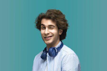 wink you. Portrait of a young beautiful man wearing white t-shirt and blue shirt with headphones smile and wink at camera over blue background.