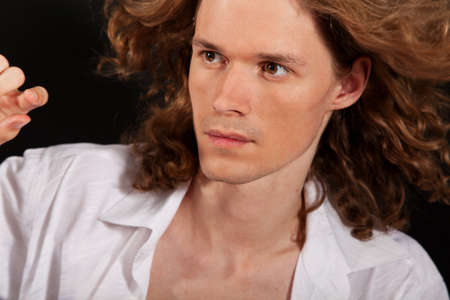 Portrait of long-haired handsome man with flying hair