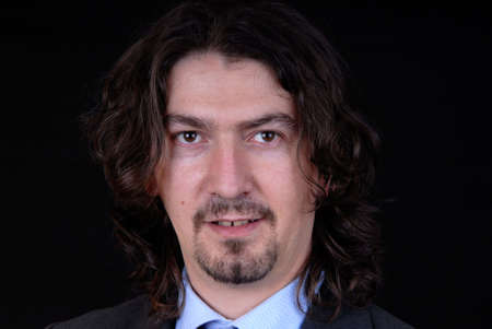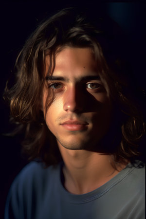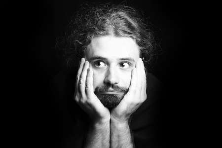 Portrait of a young man with long hair on a black background