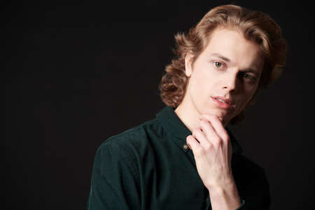 Portrait of a handsome young man with wavy blond hair on a black background. Men's beauty. Copy space.