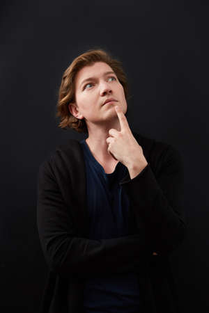 Portrait of young thinking, pensive man looks up in casuals isolated on black background.