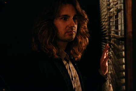 a man with long hair is standing near the window, opening the blinds with lobes, in a black jacket. look at the street, spy on people, sunrise. looking out the window