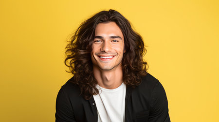 Portrait of an elegant sexy smiling Latino man with perfect skin and long hair, on a yellow background. Advertising of cosmetic products, spa treatments shampoos and hair care products, dentistry and medicine, perfumes and cosmetology for men