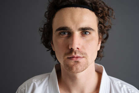Young caucasian sportsman dressed in kimono looking at camera isolated over gray background