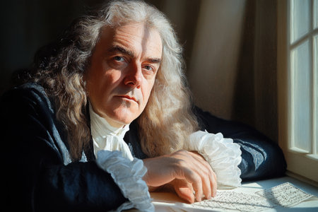 The baroque composer gazes thoughtfully at his parchment, channeling artistic genius in a sunlit room.