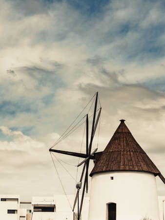 Windmill in Sanlúcar de Guadiana, in the south of Spain. Restored traditional mill located on a hill next to the town serving as a tourist attraction and viewpoint.