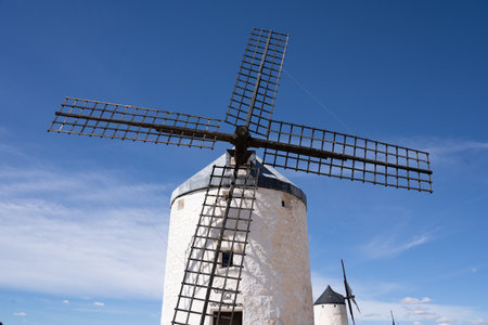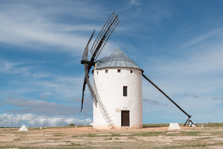Old white windmills, made of stone, on the field with blue sky and white clouds. La Mancha, Castilla, Spain. Europe,