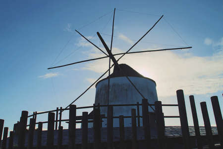 Close-up of an old Portuguese windmill. Clear sky. Windenergy.