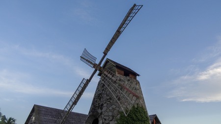 Old windmill on the background of blue sky, close-up