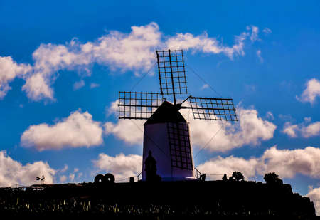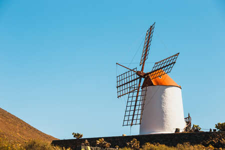 Windmill on blue sky background in cactus garden, Guatiza village, Lanzarote, Canary islands