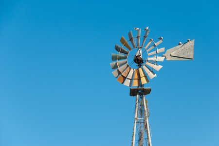 Multi-bladed windpump on blue sky background. Text for space