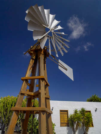 Homemade wind turbine outside a finca on the island of Fuerteventura in the Canary Islands, Spain.