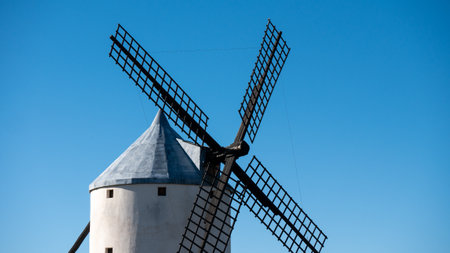 Panorama with partial view of a spanish old white windmill and its blades against an intense blue sky on a sunny day. Spanish culture