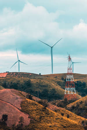 White wind turbine. n thailand and sky in the background.