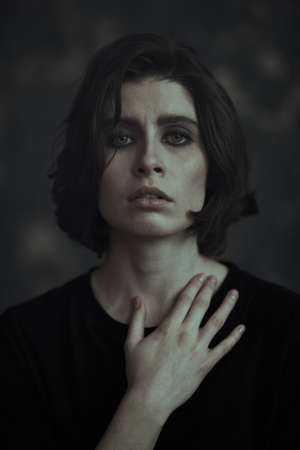 Portrait of a beautiful brunette girl with dramatic dark eye makeup looking sadly at the camera. Psychological picture. People, emotions.