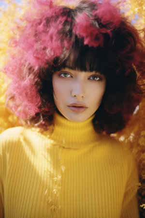 A captivating portrait of a confident young woman showcasing artistic apparel. The unique design and striking lighting create a powerful visual impact, embodying style and individuality.