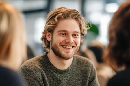 A Swedish male, radiating warmth and confidence, poses in a contemporary indoor space. The natural light enhances a cheerful ambiance, inviting positivity and connection.