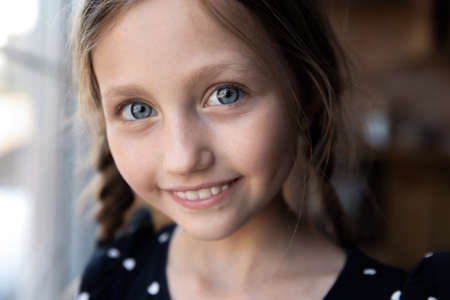Crop close up portrait of smiling cute small Caucasians blue-eyed girl look at camera feel excited overjoyed with happy childhood, positive little child kid pose, children happiness concept