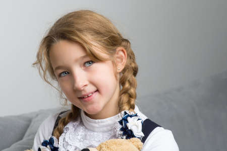 Closeup portrait of preteen beautiful blond hair girl in light room with blurred background. Female kid schoolgirl looking at the camera and smiling indoors