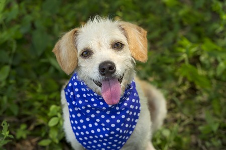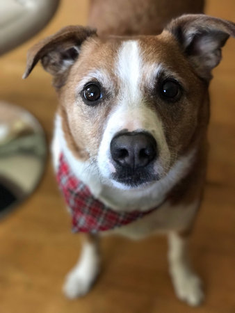 This charming dog with a colorful bandana smiles happily at the camera, bringing warmth and joy to any home setting. A true companion's expression.