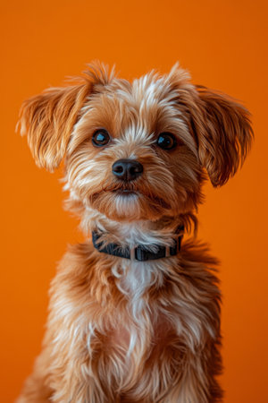 A small dog with fluffy fur and an expressive face is sitting happily against a bright yellow background showcasing its playful demeanor.