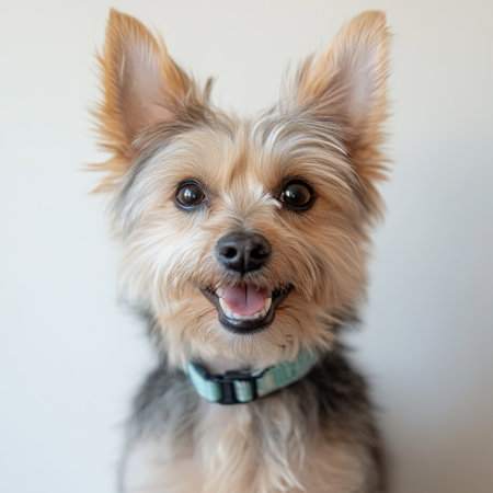 Small dog with playful expression sits happily, showing its fluffy ears and bright eyes.