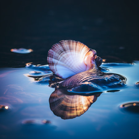 Macro shot of iridescent seashells floating in calm water, surrounded by tiny bubbles and soft ripples