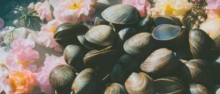 Closeup of a collection of seashells in sepia tone, perfect for natural textured backgrounds