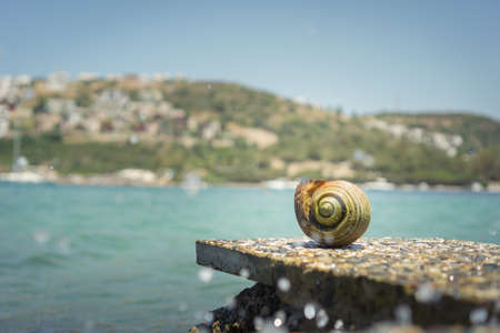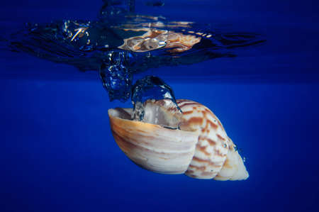 Exotic seashell by the sea. Side view with splashes.