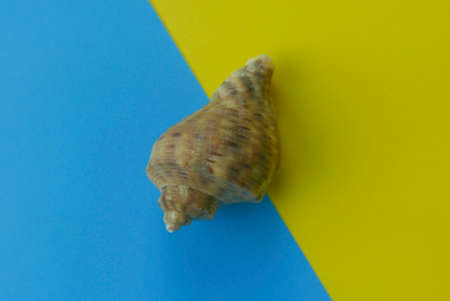 Top view of seashell on two color background which are blue and yellow.