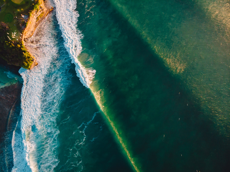 Aerial view of surfers in tropical blue ocean with waves at Bali island. Top view