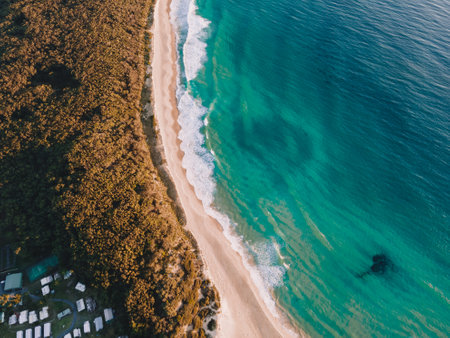 Aerial view of turquoise waves gently crashing onto a sandy beach. The oceans clear water, mixed with white foam, creates a tranquil