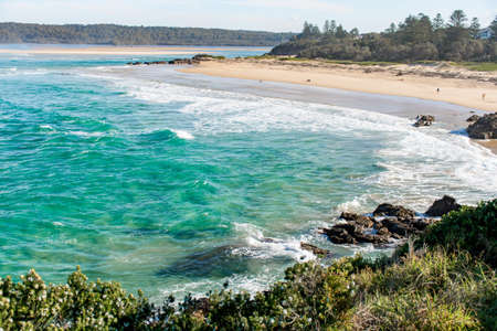 Ocean waves with white foam and sandy beach on a sunny day. Nature tropical paradise background. Tuross Head, NSW, Australia