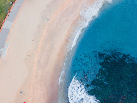 Beach Sand Sea Shore and waves white foamy summer sunny day background.Amazing beach top down view overhead seaside nature background