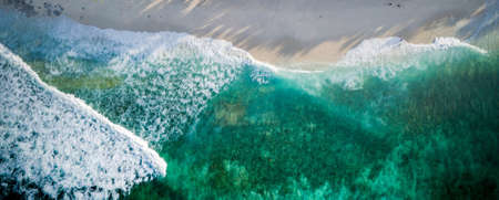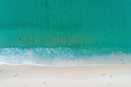 Aerial view of the Turquoise color of Ocean surface with waves washing on the coast of the Andaman ocean Amazing top down nature Landscape seascape view beautiful for travel background and website.