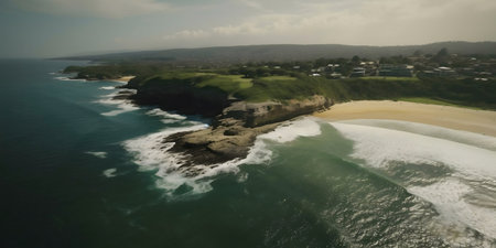 Aerial view of a beach and waves. Shot in Australia.