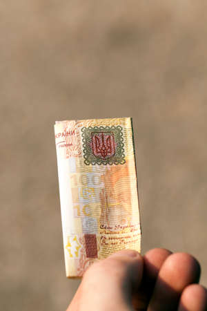 photographed close-up of two hundred Ukrainian hryvnia are in a man's hand, small depth of field