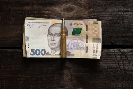 A bullet and Ukrainian hryvnia money lie on a wooden table, money for soldiers' military weapons, the war in Ukraine 2022