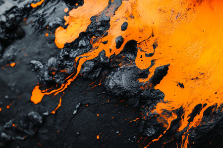Closeup texture of flowing hot lava and magma during volcanic eruption showcasing vibrant orange and black contrasts in natural disaster