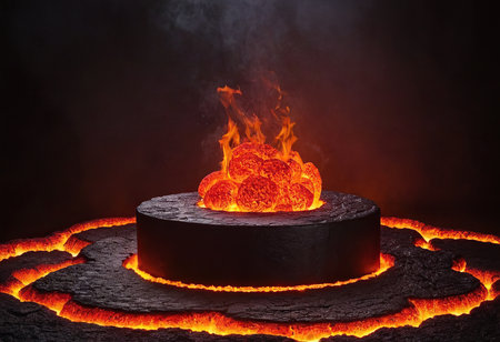 Burning lava on a black podium with smoke on a dark background