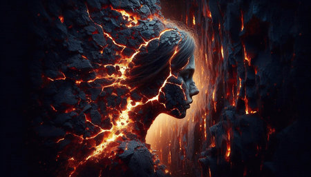 A captivating visual of a face fused with lava, highlighting intricate cracks and glowing patterns. This artwork embodies the dynamic interplay between humanity and nature.
