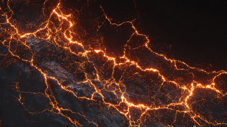 Vivid orange lava snakes through a dark, cooled lava, highlighting natures fiery power. Created with Generative AI