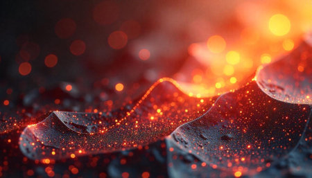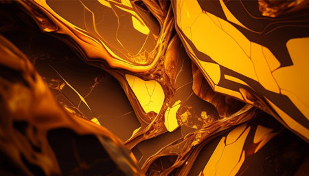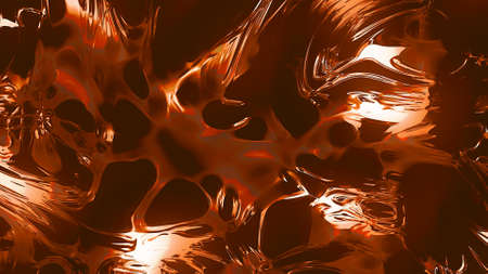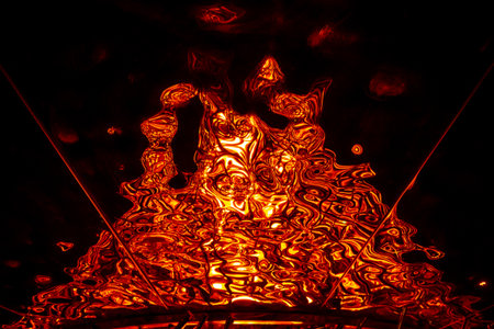 A pattern of firelight and reflections on a glossy surface, golden-red swirls and shimmers. An abstract natural structure with a vibrant contrasting appearance on a dark background