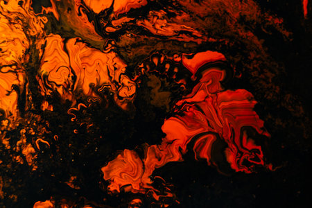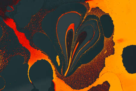 Fluid art texture. Abstract background with mixing paint effect. Liquid acrylic picture with artistic mixed paints. Can be used for wallpaper. Trendy colors of 2021 year - orange, black