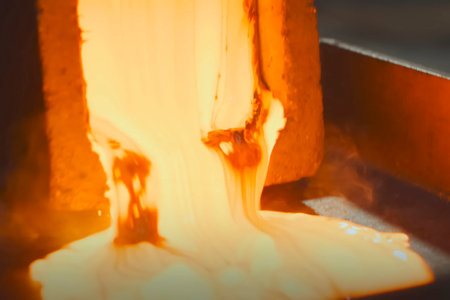 Industrial molten metal casting: liquid gold-like material flows into a precision mold with sparks flying