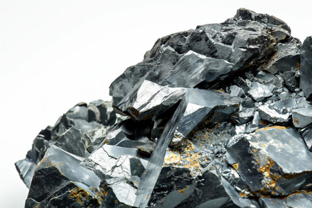 Macro shooting of natural gemstone. The raw mineral Galena, Morocco. Isolated object on a white background.