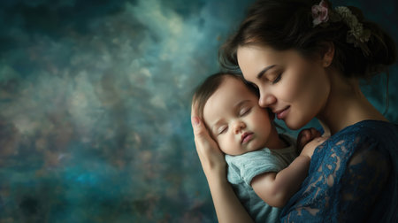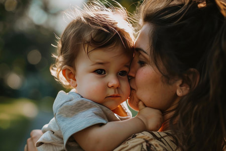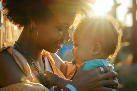 A woman holds a baby, their foreheads touching in a tender moment. The scene is illuminated by gentle natural light, creating a warm, intimate atmosphere. The composition emphasizes the connection between the mother and child. It is suitable for illustrating themes of family, love, and care. Potential applications include editorial and commercial projects.