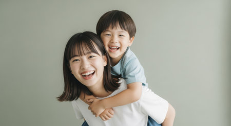 Happy asian sister giving a piggyback ride to her younger brother, both smiling broadly and looking at the camera, symbolizing family bond and joy.