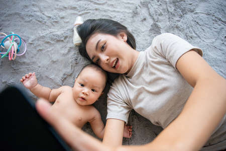 Happy Asian mom and son newborn lying and use smartphone for video conference or social media during stay at home, Mother and baby take photo selfie on grey carpet.